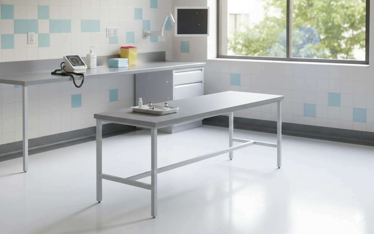 A sturdy, industrial-grade work table designed for laboratory or medical environments.