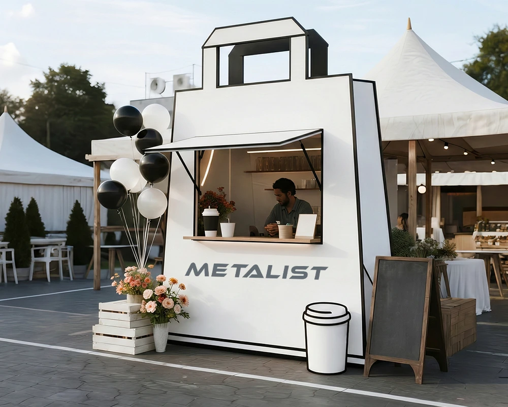 Modern box-style structure with a front service window,