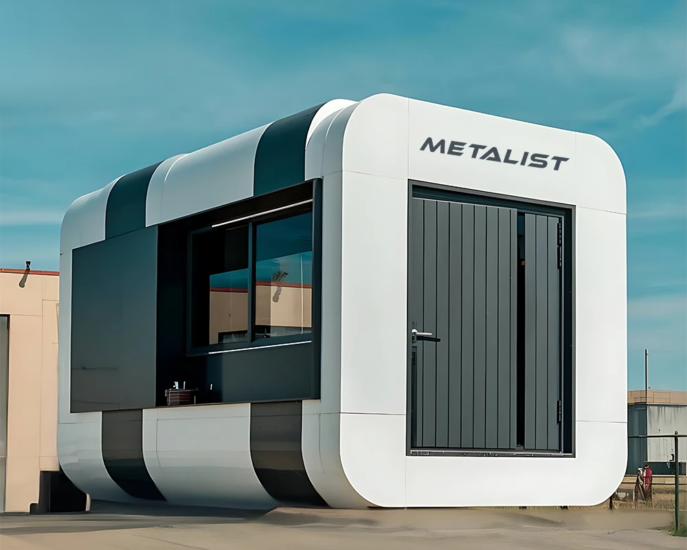 Modern box-style structure with a front service window,