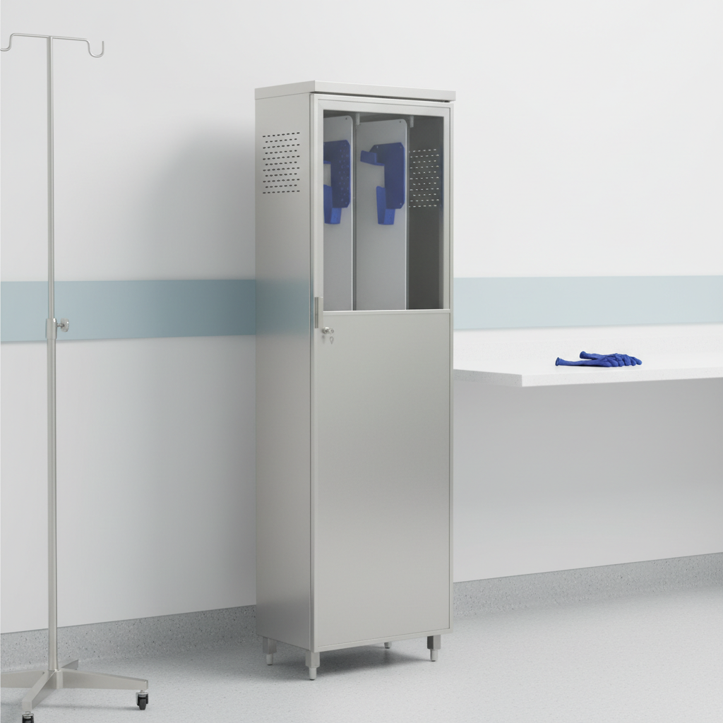 A tall, slender stainless steel cabinet specifically designed for storing endoscopes.
