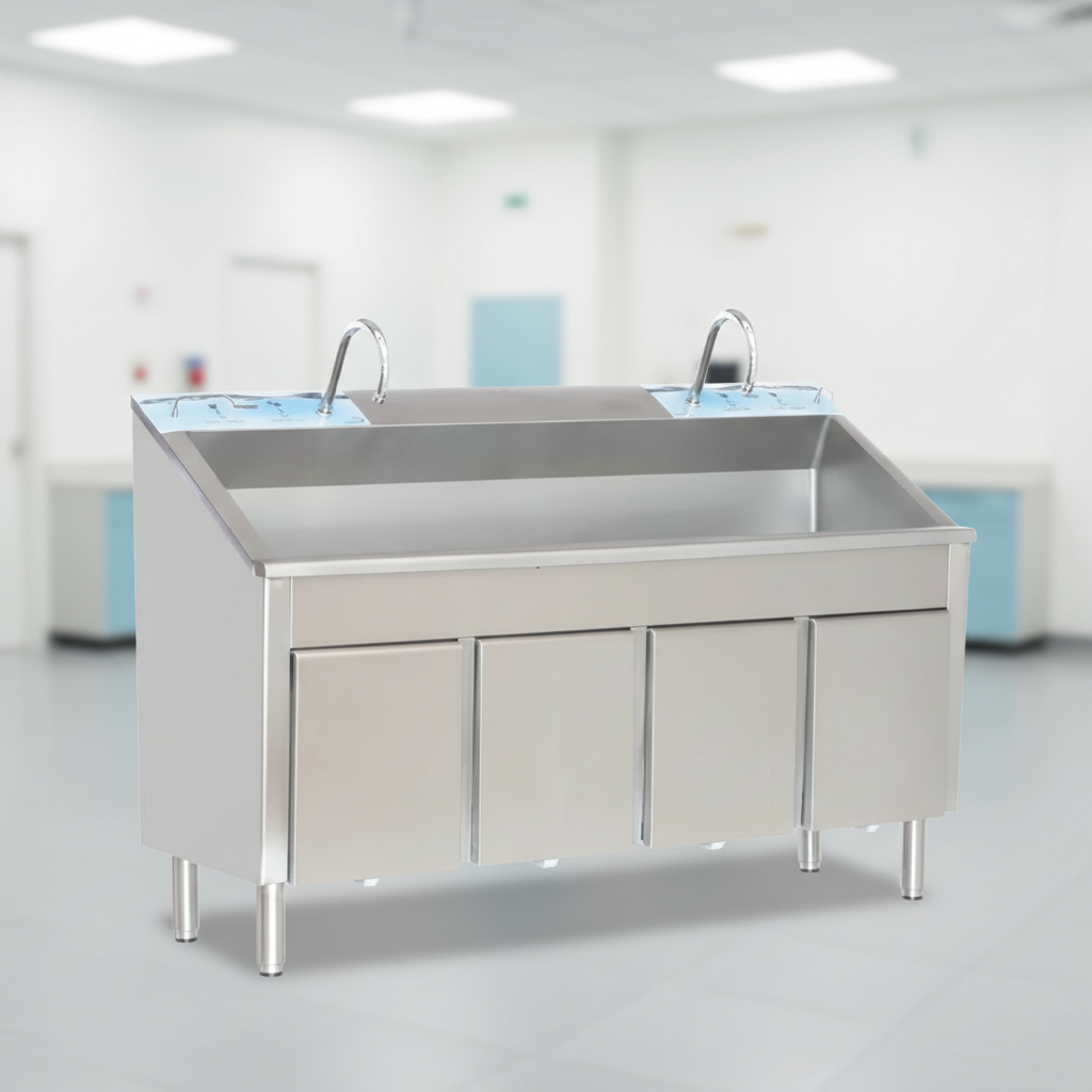 This is a heavy-duty, large-scale stainless steel scrub station featuring